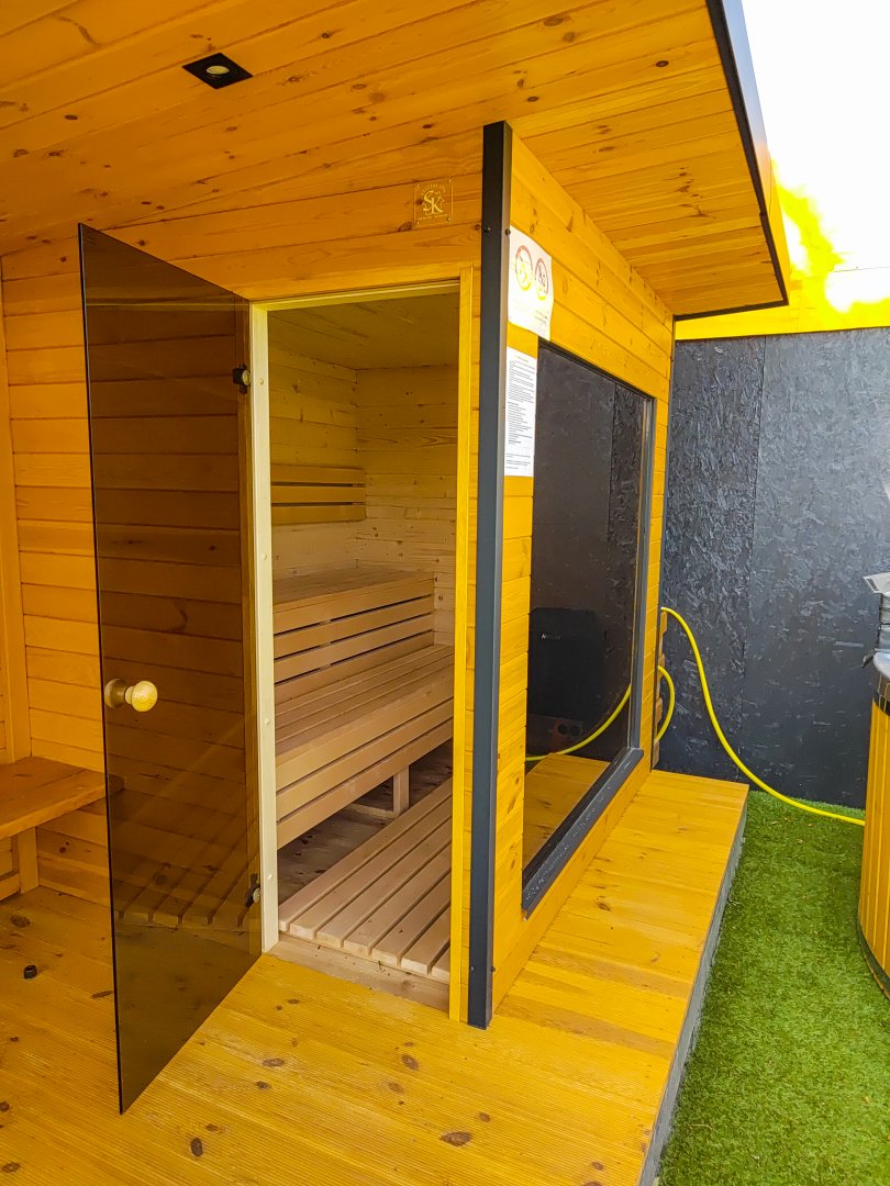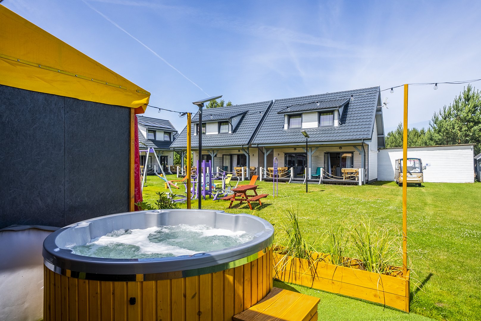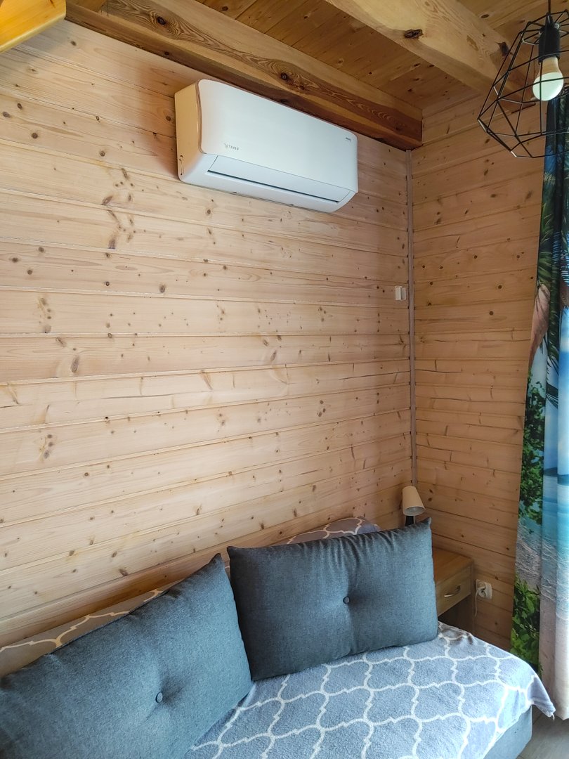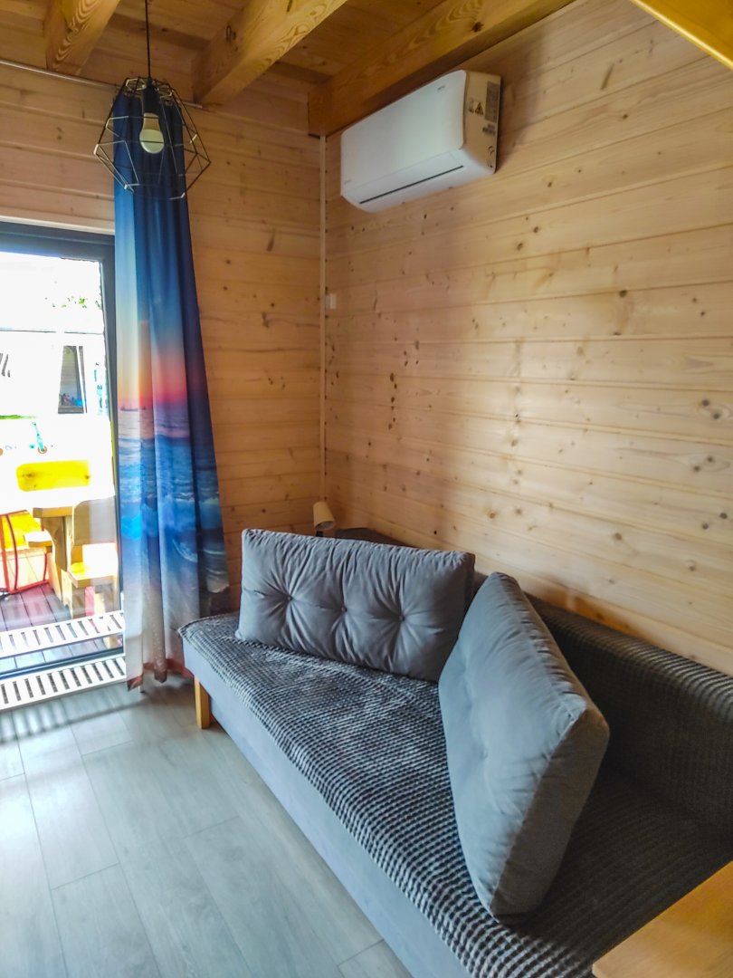 Na parterze każdego z nich znajduje się salon w którym jest rozkładana sofa dla dwóch osób oraz telewizor, aneks kuchenny w który wyposażyliśmy w płytę grzewczą, lodówkę, czajnik, kuchenkę mikrofalową oraz akcesoria kuchenne oraz łazienka z kabiną prysznicową. Z salonu jest wyjście na taras na którym znajduje się zestaw wypoczynkowy. Na piętrze, znajduje się sypialnia z łóżkami dla 4 osób.